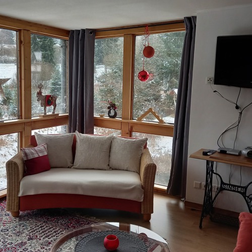 Unsere Ferienwohnungen sind gemütlich komplett eingerichtet und verfügen über eine moderne Küche mit Ceranherd, Kaffeemaschine, Wasserkocher, Toaster, Microwelle und Kühlschrank mit Gefrierfach. Außerdem finden Sie ein Bad mit Dusche und WC. In den Wohnungen "Spatzennest" und "Sonnenschein" befindet sich das Wohnzimmer im Stil eines Wintergartens mit herrlichem Blick in die Natur, ausgestattet mit Flachbild-TV. Die Wohnung "Hutz`nstub" bietet zusätzlich zum Elternschlafzimmer ein ausgebautes DG mit Platz für größere Familien mit bis zu 4 Kindern.